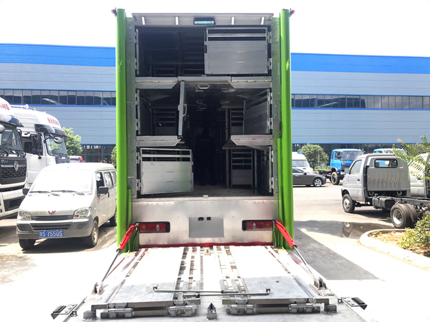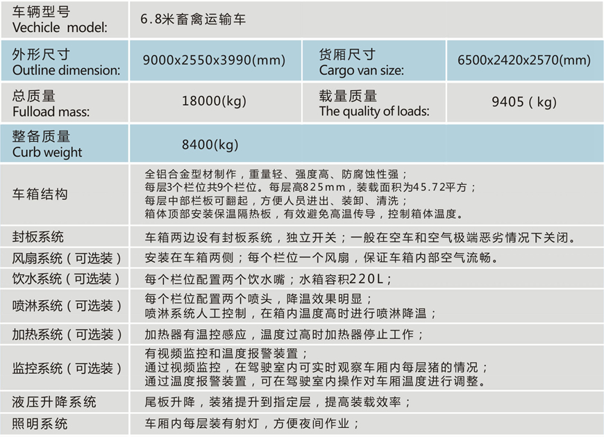 标配:三层,喷淋,喂食,监控,照明,机组,可开合侧窗,高转速防水通风排气扇,混合隔仓,液压垂直升降尾板。