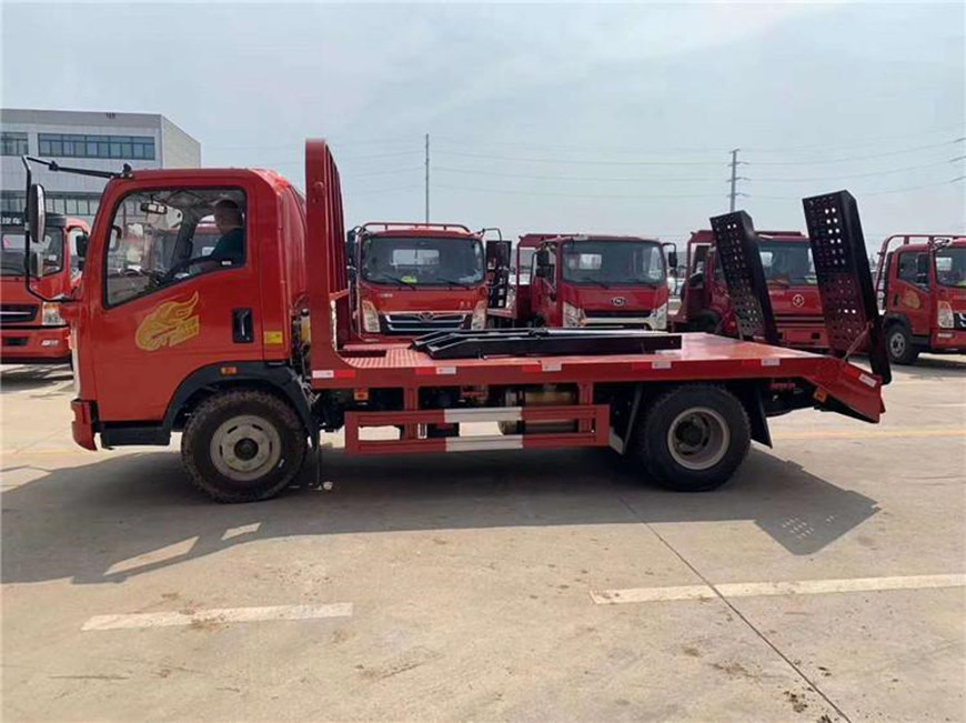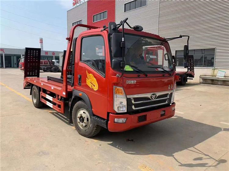 【上装配置】此车上装全部采用锰钢生产,超级耐用,轻量化,不超重,平板底板横梁采用100*100*5mm方管,底板采用5mm花纹板,带加密斜支撑,斜坡处带后支腿,,可以选择货箱带栏板设计,平板长度4.2米,宽度2.4米 ,可拉8-9吨挖机。